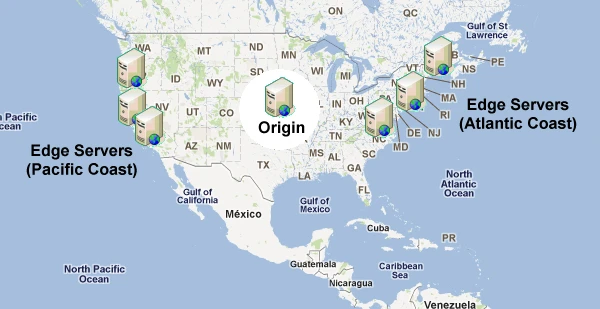 如果不使用 CDN,那所有用户的请求都会直接导向单一的源服务器(Origin Server)。而如果启用了 CDN 服务,那么 CDN 服务提供商会分配给你若干个节点,这里以上图为例,比如分配给你的服务器 3 个东海岸的节点和 3 个西海岸的节点。