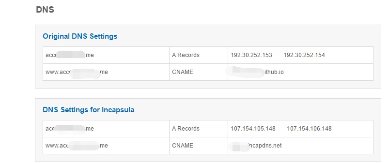 注册完Incapsula后,添加你要使用CDN的域名,然后就是检测,它会提供两个A Record(一般是两个)以及一个CNAME Record给你更改,你可以在你自己的域名管理处,更改就行了,依照它的说明重新指向,将你原来指向github的两个A Record替换为它给定的,一个CNAME Record替换为它给定的,等一会儿就行了,github博客里的CNAME仍然是你的域名
