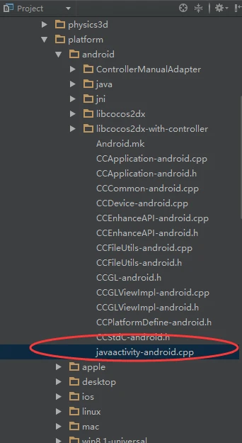 jni交互的地方可以在上图红框处找到,目录实际为${ProJect_Root}/cocos2d/cocos/platform/android/,