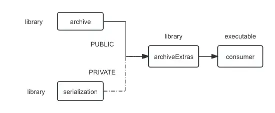 target_link_libraries(consumer archiveExtras)由于archive是archiveExtras的PUBLIC 依赖项, 因此它的使用要求也会传递给consumer. 因为serialization是archiveExtras的私有依赖,所以它的使用要求不会传递给consumer.