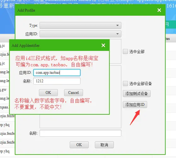 - 选择刚创建的appid 应用id 如com.app.taobao,勾选关联第一步创建的ios证书p12,选择刚添加要测试的设备。