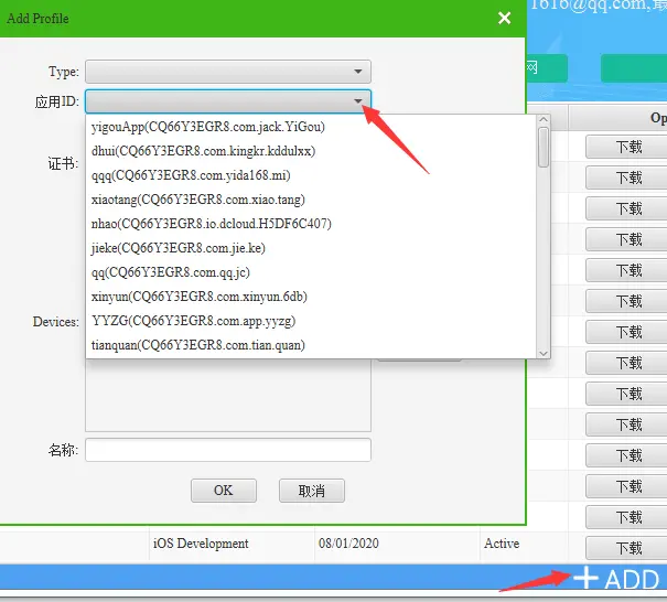 - 点击右下角+ADD选择, 下拉选择iOS开发证书