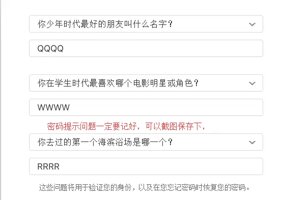 - 安全提示问题设置一定要记住保存好,可以截图保存