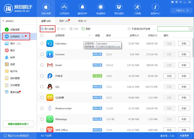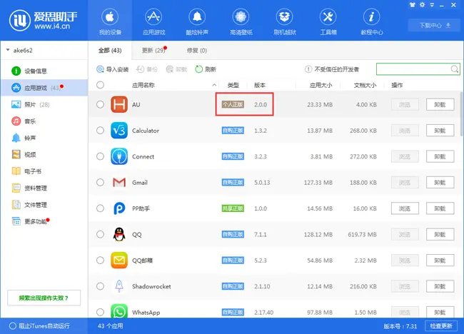 1、普通账号申请的ios证书打包的ipa、经测试,苹果官方的iTunes助手安装不了,不要用这个. 用爱思苹果助手可以成功安装