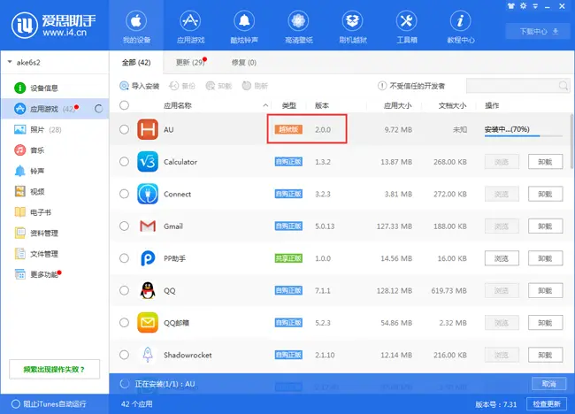 2、ipa将自动安装,类型是越狱版,安装成功后显示个人正版,因为是个人ios证书打包,没上架App Store