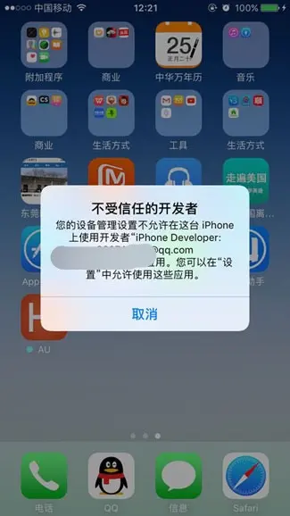 3、安装成功了第一次启动应用会出现如下提示,用测试证书或者企业证书打包的ipa都会这样,需要设置一下